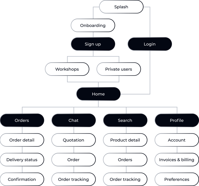 User flows and system structure were defined to support the most frequent workshop tasks—requesting spare parts, approving quotations and tracking deliveries—while keeping interactions simple and mobile-first.