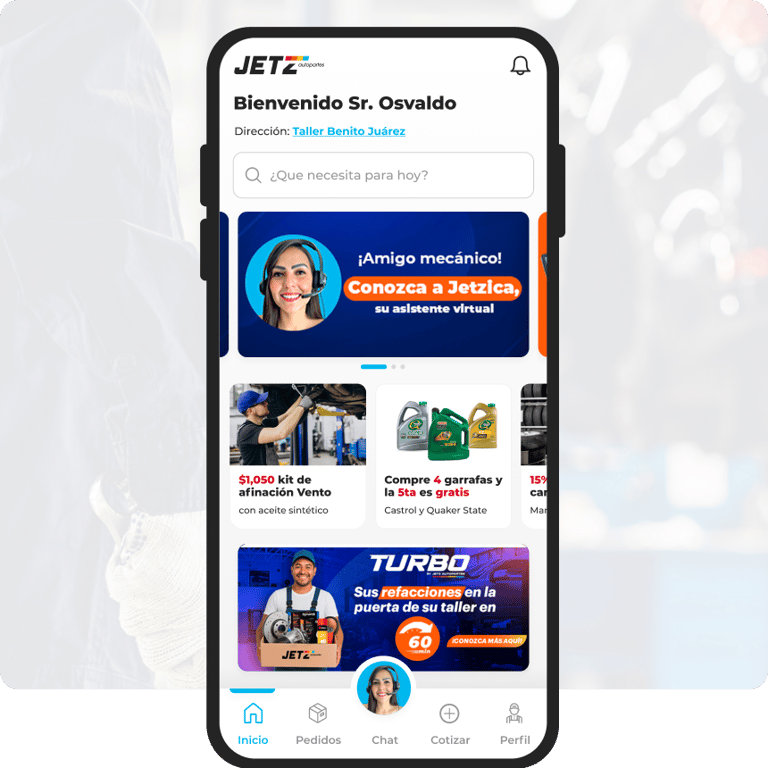 Central access point to chat, active orders, search and promotions, prioritizing the most frequent actions.
